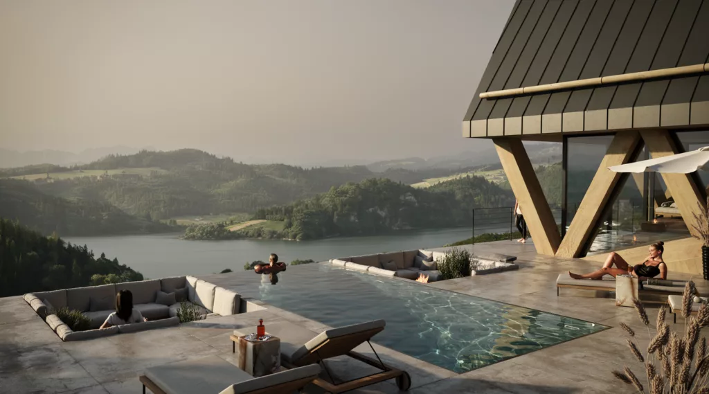 Wyjątkowa nieruchomość położona jest na zboczu z panoramicznym widokiem na Jezioro Czorsztyńskie i otaczające je pasma górskie.