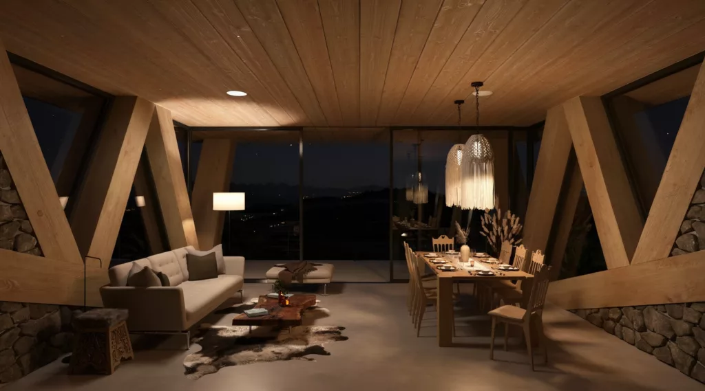 Poziom 0 — reprezentacyjna część dzienna z dużym salonem, jadalnią i kuchnią w układzie otwartym. Rozległe przeszklenia otwierają się na panoramiczny taras z widokiem na jezioro i góry.